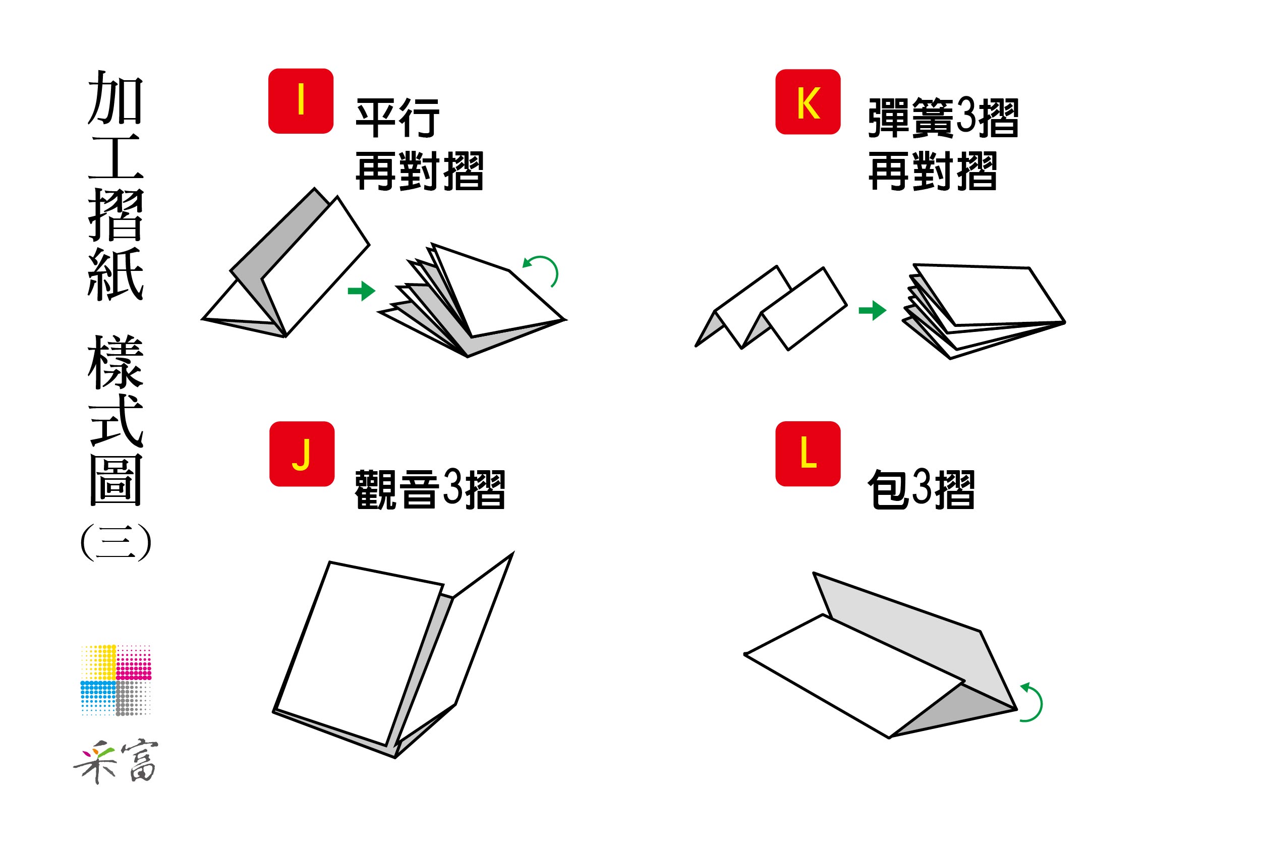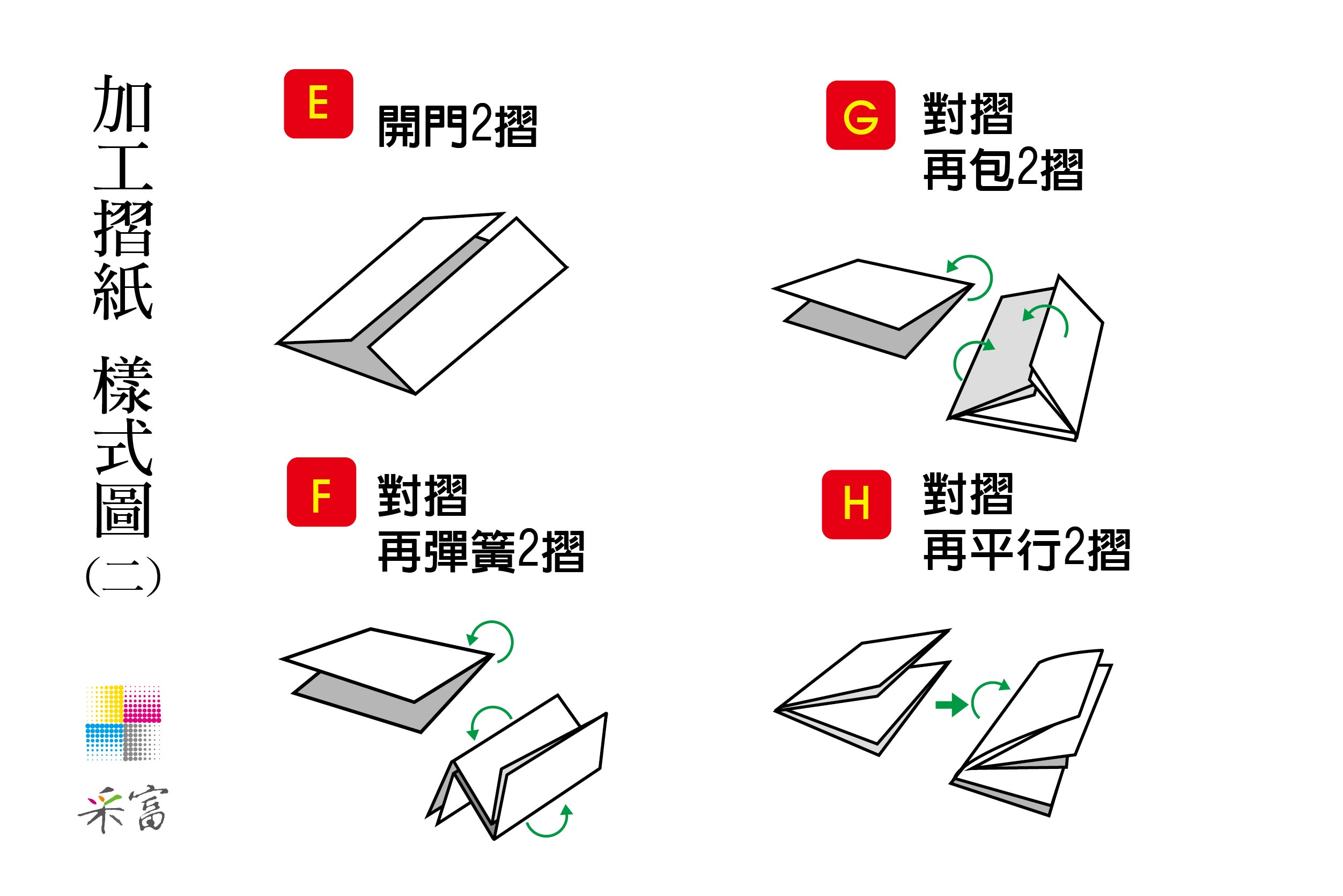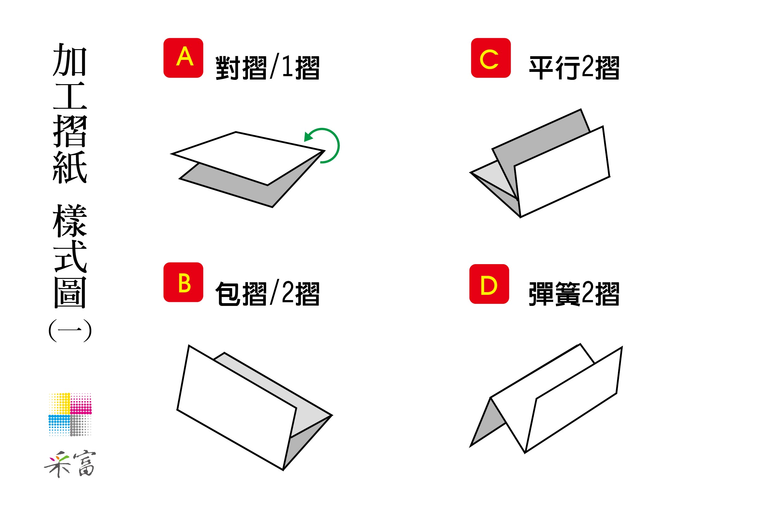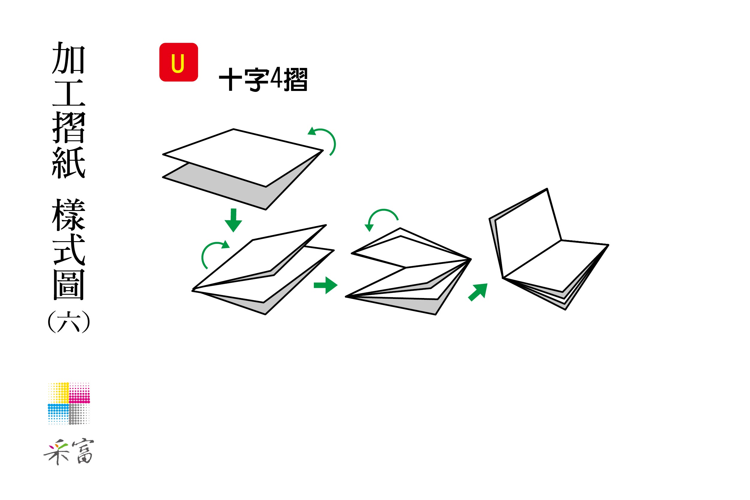 3. 五摺以上的摺紙,因難度較高,故耗損會增加,印刷時需多加放數6%以上。