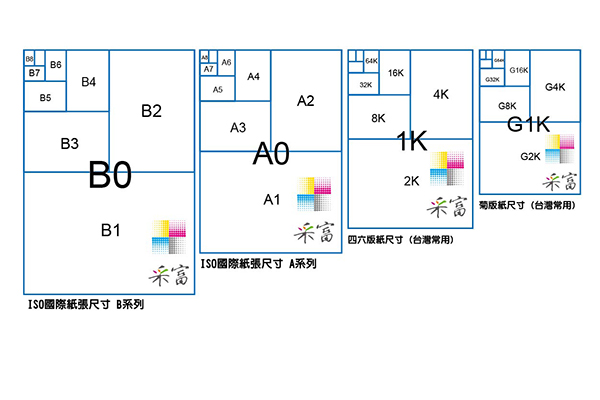 台灣目前常用紙張基本尺寸一般分為下列四種: 1. 四六版紙(又稱全紙)=31″× 43″(英吋)(相當於ISO的B1的規格)適合各種印刷品之印製,為台灣最常用的基本尺寸。