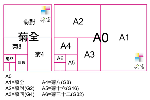 2. 菊版紙=25″× 35″ (英吋)或24.5″× 34.5″(英吋)(相當於ISO的A1規格)適合書刊、雜誌、事務用品之印製。