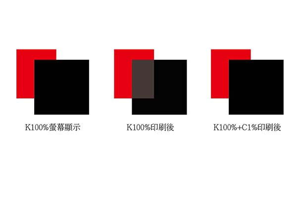 在製作設計稿時,運用到黑色是常有的情況,黑色直印是為避免黑色與底色套印不準而造成露白現象,因此填色K100%的向量色塊或線條下,不能襯有其它顏色,以免造成疊印,建議可將K100%的向量填色加填上C1%,或是黑色色塊填色改為K99%,就可避開疊色現象。