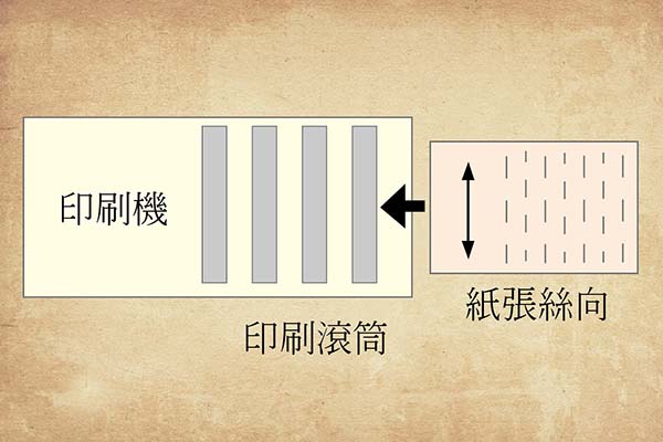 印刷時絲向與印刷滾筒平行,可以避免紙張伸縮及套印不準,或打皺.或摺痕的問題.目前印刷機多能將紙張伸縮影響降到最小。