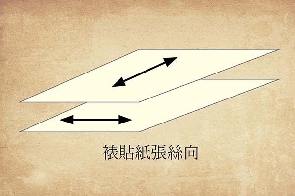 紙張或紙板裱貼時,絲流方向要相互垂直,紙張受潮捲曲變形, 剛好上下左右相互抵銷,使紙張在裱貼時不會因濕氣而變形,保持紙面平整,挺度增強,否則裱貼時因受捲方向相同產生加乘作用,而擴大變形現象。