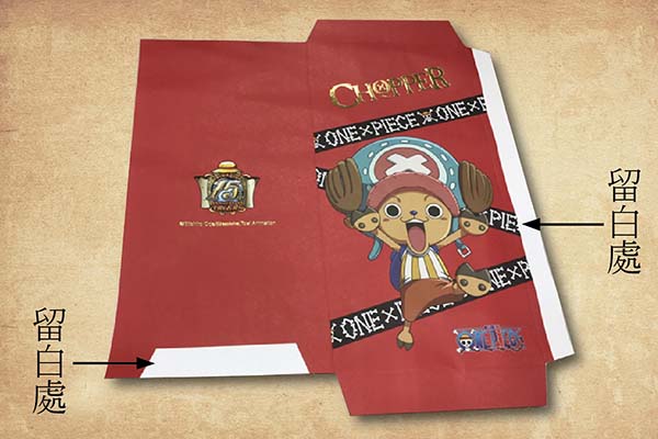 1.紅包袋成形前,糊邊需要留3/2白邊不能印刷,側邊+底部都需要留白,如果沒有留白而去印刷滿版,膠是黏不上去,會產生假性黏合,容易脫落,但留白也不能留太大,軋型時位置會有點偏差,如果白邊留太大,糊封不準時,容易跑白邊。