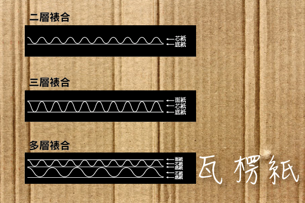 瓦楞紙板的構成是由「裱面紙」與「芯紙」兩種原紙裱合而成,如圖所示。
